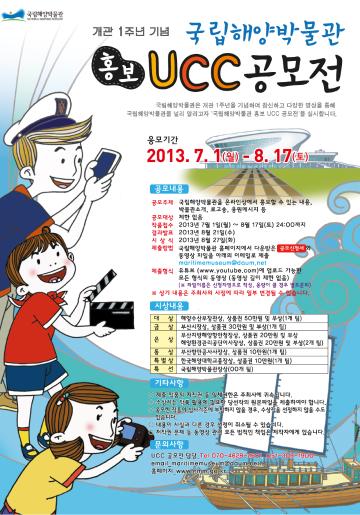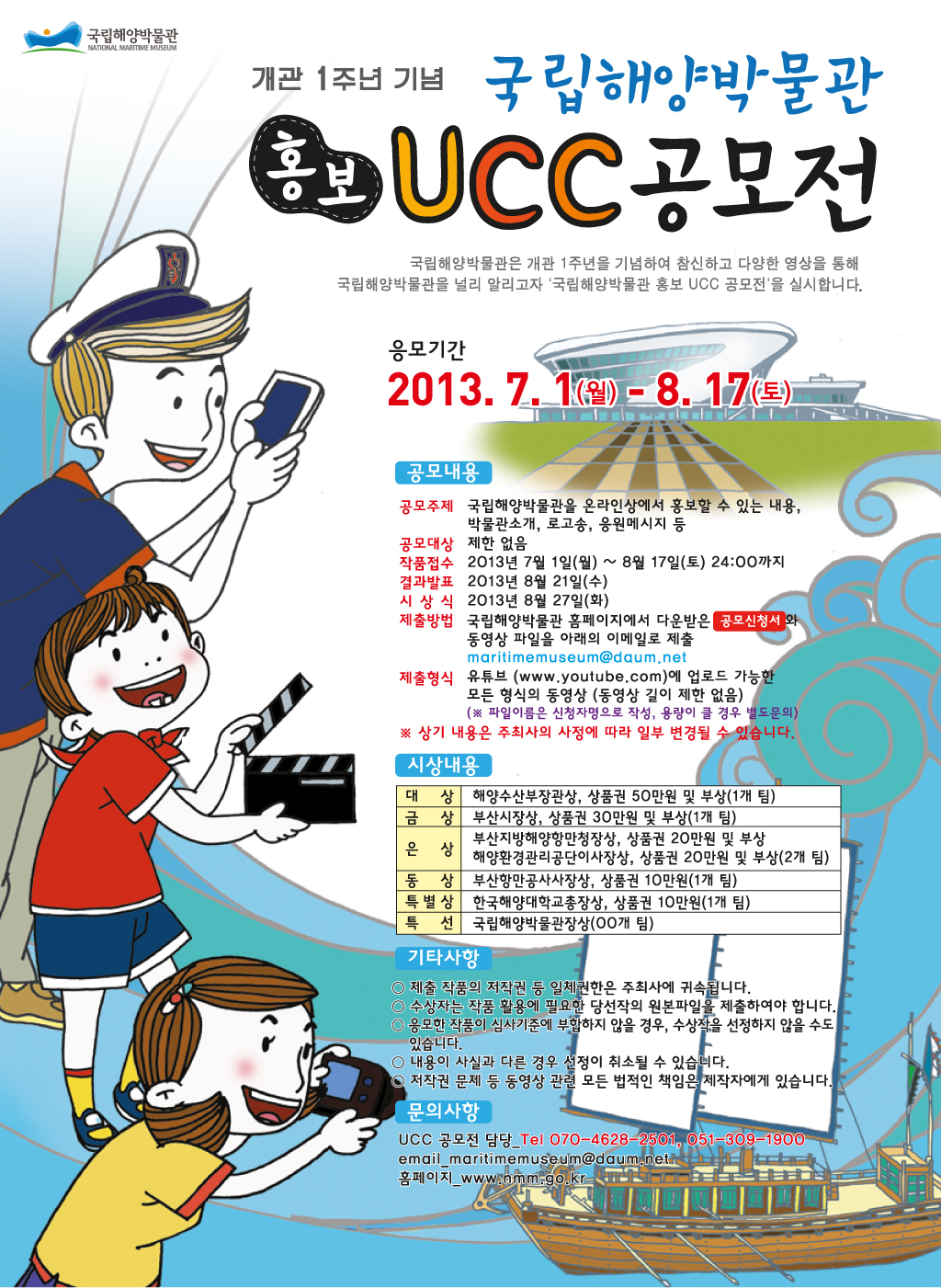 국립해양박물관은 개관 1주년을 기념하여 참신하고 다양한 영상을 통해 국립해양박물관을 널리 알리고자 ' 국립해양박물관 홍보 UCC 공모전' 을 실시합니다