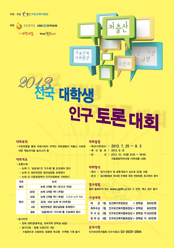 - 최우수상(1팀) : 인구보건복지협회장상 + 장학금 600만원