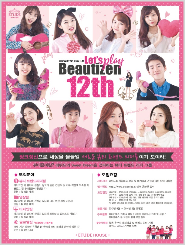 - < 에뛰드하우스 뷰티즌 12기 모집 > 핑크정신으로 세상을 물들일 새로운 뷰티 트렌드 리더들 여기 모여라! "뷰티즌"이란? 에뛰드의 Sweet Dream을 전파하는 뷰티 트렌드 리더 그룹