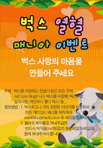 주제 : I♡BUGS, 벅스사랑 대상 : 누구나 모집분야 : 배너공모(540*125 size) 응모방법 : event@bugsmusic.co.kr 로 개별접수 시상내역 : 당선작은 벅스 사이트내에서 1개월간 당선 배너게재 발 표 : 5월 18일 벅스 사이트내