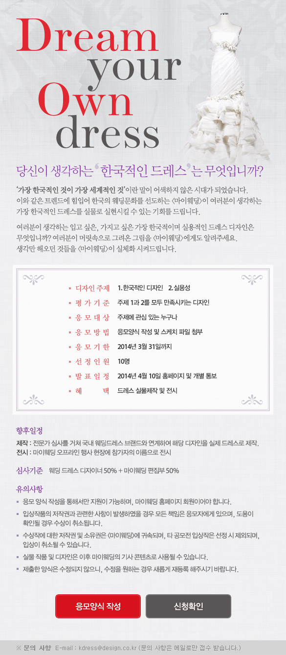 여러분이 생각하는 입고 싶은, 가지고 싶은 가장 한국적이며 실용적인 드레스 디자인은 무엇입니까? 여러분이 머릿속으로 그려온 그림을 < 마이웨딩> 에게도 알려주세요.