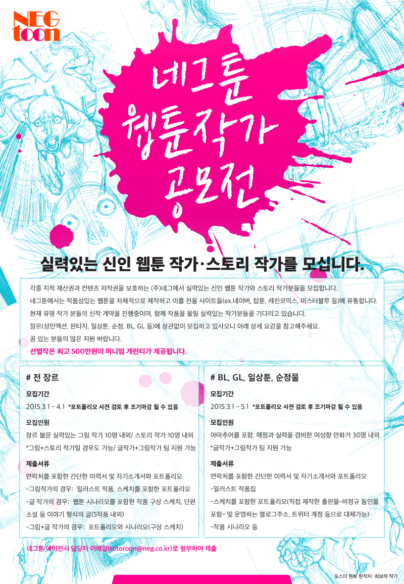 컨텐츠 저작권을 보호하는 (주)네그에서 실력있는 신인 웹툰 작가와 스토리 작가분들을 모집합니다. 네그툰에서는 작품성 있는 웹툰을 자체적으로 제작하고 이를 전용 사이트(ex. 네이버, 탑툰, 레진코믹스, 미스터블루 등)에 유통합니다. 현재 유명 작가분들의 신작 계약을 진행중이며, 함께 작품을 올릴 실력있는 작가분들을 기다리고 있습니다. 장르(성인액션, 판타지, 일상툰, 순정, BL, GL 등)에 상관없이 모집하고 있사오니 아래 상세요강을 참고해주세요. 꿈있는 분들의 많은 지원 바랍니다.