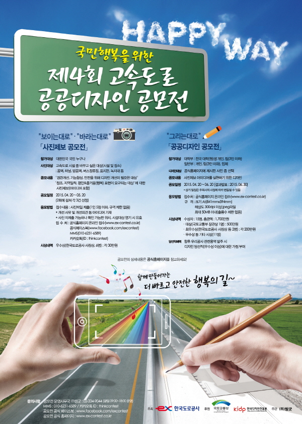 - 공모내용 : 고속도로 경관개선, 안전을 위해 디자인 개선이 필요한 대상 및 창조, 지역밀착, 평안&즐거움(행복), 기능향상 표현이 요구되는 대상에 대한 사진제보(아이디어 포함)