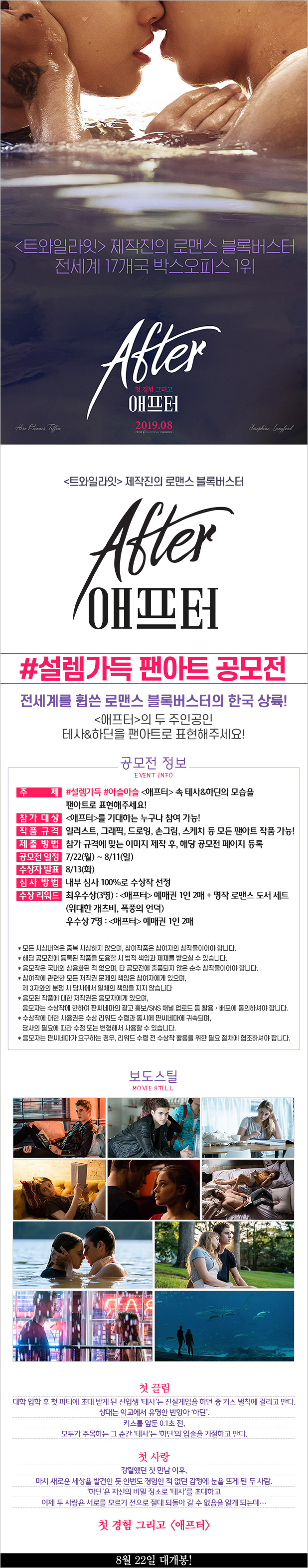 최우수상(3명): <애프터> 예매권 1인 2매 + 명작 로맨스 도서 세트(위대한 개츠비, 폭풍의 언덕)