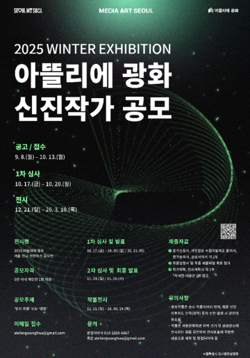 <아뜰리에 광화>는 시민이 향유하고 공감할 수 있는 미디어아트와 영상콘텐츠 등 전자적 빛으로 이루어진 예술작품을 지속적으로 전시하는 미디어플랫폼으로, 공공 미디어아트의 영역을 확장하고 작가·시민과 함께 만들어가는 공유 가능한 미디어 스크린입니다. 2025년 ‘신진작가 공모전’은 ‘빛의 흐름’ 또는 ‘영원’을 주제로 역량 있는 미디어아티스트의 예술작품을 공모를 통해 선정하고 자연에 대한 예술적 세계관을 살펴보는 공공 미디어아트 전시입니다. 미디어아트의 가능성과 공공 미디어아트의 확장을 보여줄 ‘신진작가 공모전’ 공모를 다음과 같이 공고하오니 열정 있는 예술가분들의 많은 참여 바랍니다.