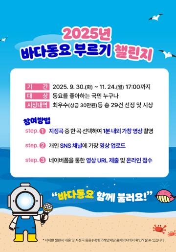 - 자세한 챌린지 내용 및 지정곡 등은 (재)한국해양재단 홈페이지에서 확인하실 수 있습니다.