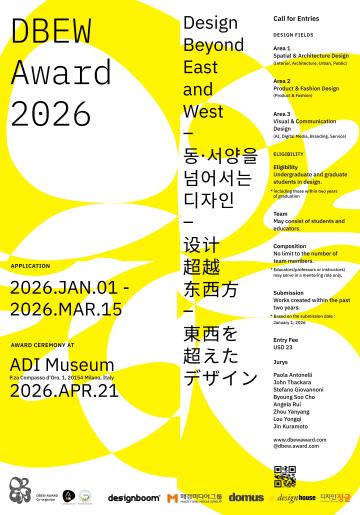 세계적 권위의 Compasso d’Oro(콤파쏘 도로)를 수여하는 기관인 ADI Design Museum과아시아를 대표하는 디자인 교육기관인 국민대학교가 공동 주최하는 ‘DBEW Award 2026’이2026년 1월 1일부터 3월 15일까지 전 세계 디자인 학생 및 교육자들을 대상으로 작품 접수를 진행합니다.
