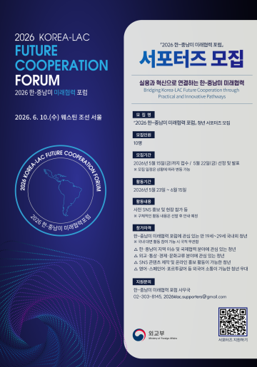 대한민국 외교부에서 주최하는 2026 한-중남미 미래협력 포럼 서포터즈를 모집합니다.