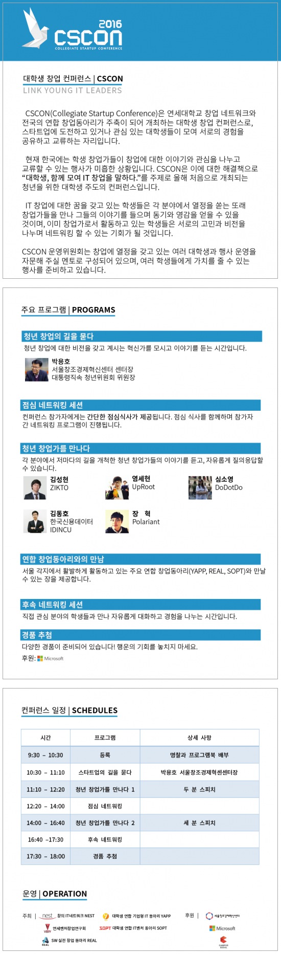 CSCON은 "대학생, 함께 모여 IT 창업을 말하다."를 주제로 올해 처음으로 개최되는 대학생을 위한 대학생 주도의 컨퍼런스로, 이번 회의 테마인 ' IT 창업' 을 주제로 각 분야에서 열정을 쏟는 또래 창업가들이 서로 만나 이야기를 공유하며 동기와 영감을 얻고, 네트워킹하는 기회를 제공합니다. 연세대학교 창업동아리 연합이 중심이 되어 전국 연합창업동아리들과 함께 전국의 대학생 혁신가들을 모시고 을 준비하고 있습니다.