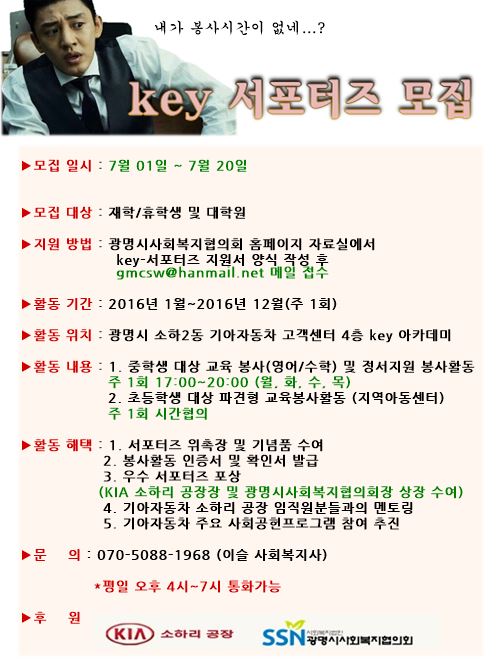 - 광명시 사회복지협의회 홈페이지 자료실에서 KEY-서포터즈 지원서 양식 작성 후 gmcsw@hanmail.net 메일로 접수