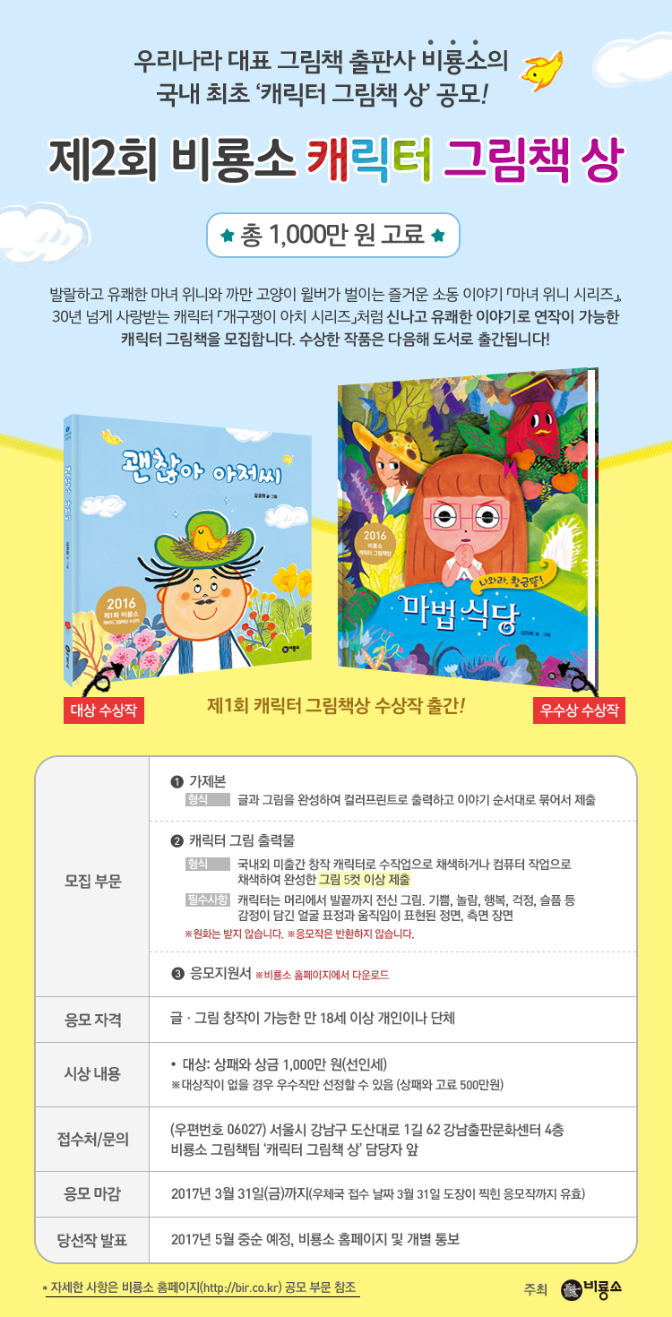 - 응모작 발송 겉봉투에 ‘제2회 비룡소 캐릭터 그림책 상 응모작’이라 명기해야 합니다.