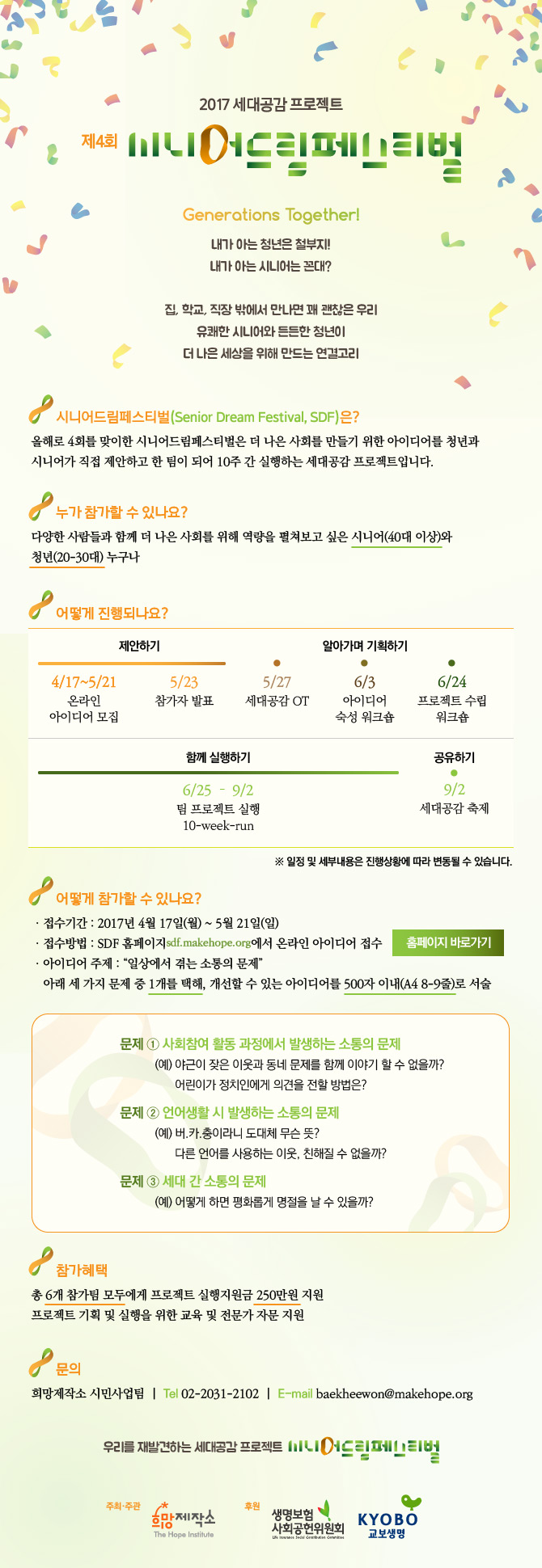 - 시니어드림페스티벌은 더 나은 사회를 만들기 위한 아이디어를 청년(2-30대)과 시니어(40대 이상) 직접 제안하고 한 팀이 되어 실행하는 프로젝트입니다.