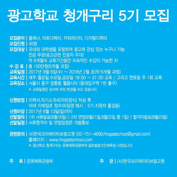 - 사)한국크리에이티브광고원 (Tel.02-751-4690 / E-mail.frogadschool@gmail.com )