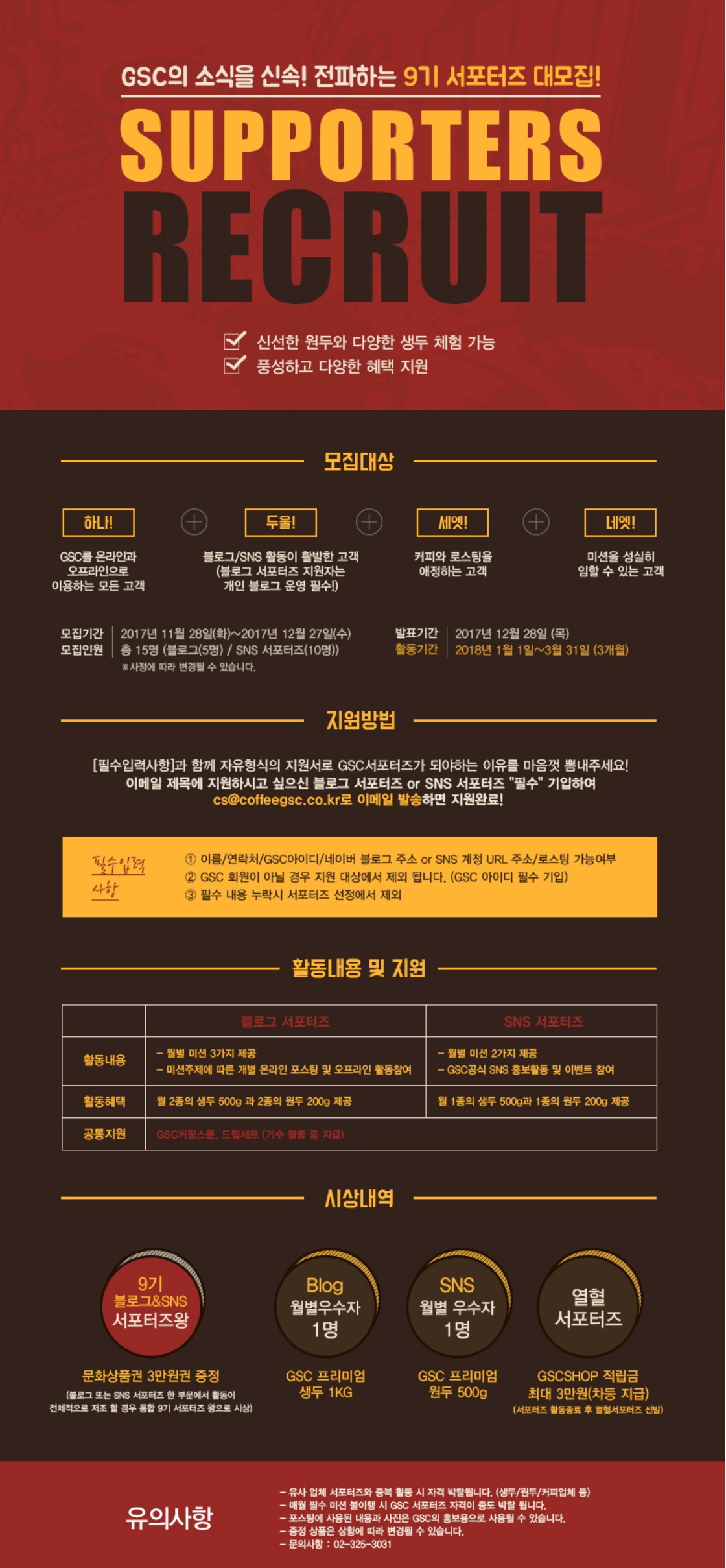* 공통지원 : GSC커핑스푼, 커피 드립세트(기수활동 중 지급), 서포터즈 활동 완료 후 적립금 최대 3만원 지급(차등지급)