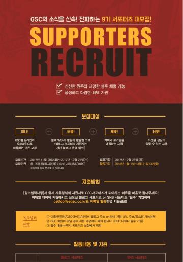 - [필수입력사항]과 함께 자유형식의 지원서로 GSC 서포터즈가 되어야 하는 이유를 마음껏 뽐내주세요! 이메일 지원하시고 싶으신 블로그 서포터즈 or SNS 서포터즈 필수 기입하여 cs@coffeegsc.co.kr 로 이메일 발송하면 지원완료!