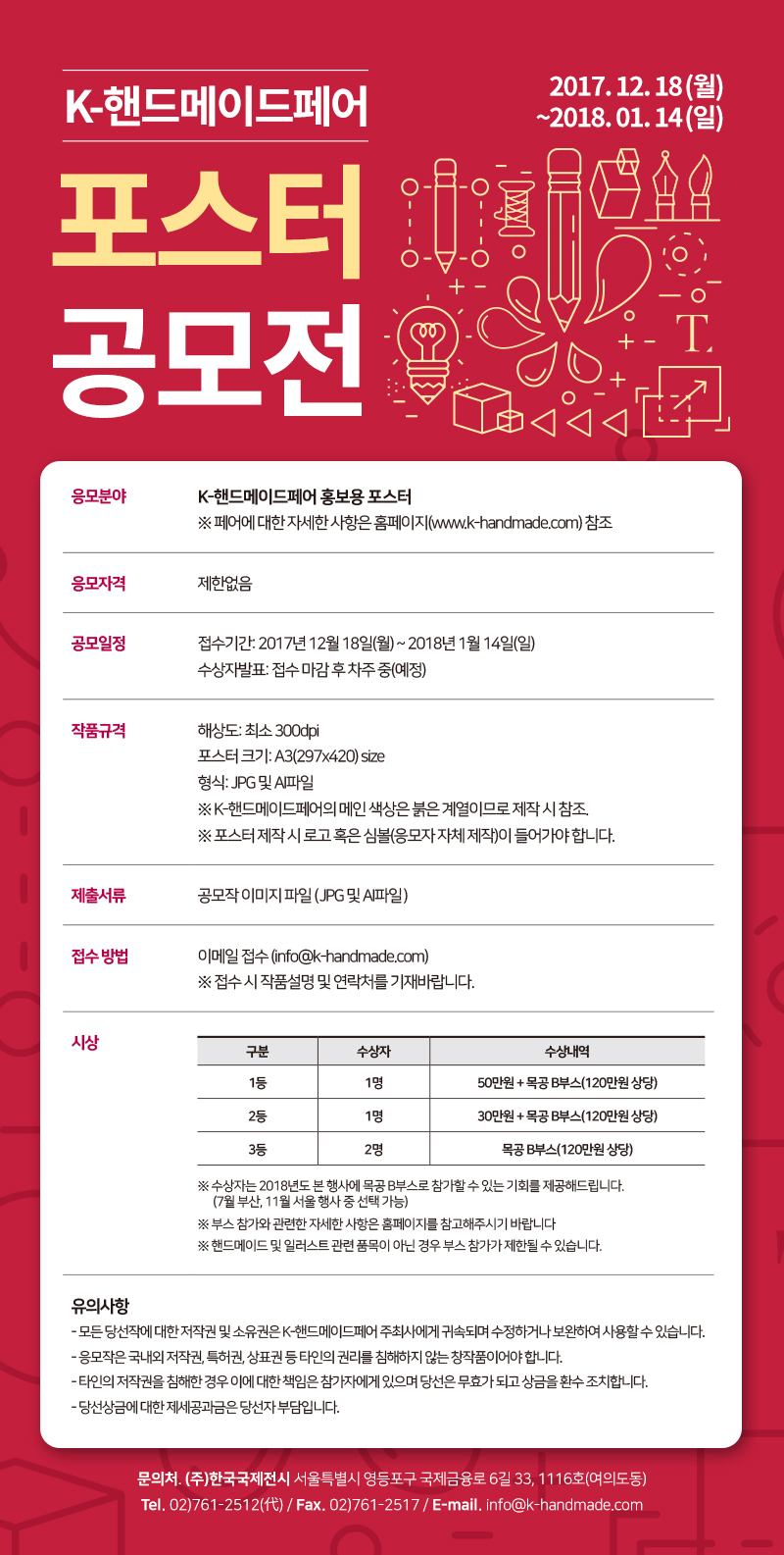 - 모든 당선작에 대한 저작권 및 소유권은 K-핸드메이드페어 주최사에게 귀속되어 수정하거나 보완하여 사용할 수 있습니다.