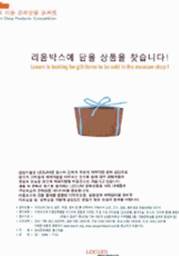 공모방향 자유소재(도자, 섬유, 목공, 금속 등)을 선택하여 인테리어 소품, 문구, 잡화, 패션 등의 문화상품을 디자인 응모부분 - 리움로고와 리움건축물을 모티브로 응용한 디자인. - 리움 소장 고미술품 (금속공예, 불교미술, 도자기, 고서화 등)을 응용한 디자인 (리움 건축물 사진과 고미술품은 www.leeum.org 에 소개되어 있으나 데이터는 다운로드 받을 수 없습니다.) 응모자격 팀 또는 개인(인원수는 제한 없음) 응모요령 및 접수 제출자료 1) 출품원서 1부 : 출품원서를 다운로드 받아서 작성 후, 디자인 시안 뒷면, 왼쪽 하단에 부착 2) 디자인시안 : A2 사이즈 우드락(세로) 에 재질, 규격을 알아 볼 수 있도록 표기. 디자인은 정면 측면 배면 등을 표현 (시제품을 제작하신 분은 디자인 시안과 함께 제출) 접수방법 : 우편접수 및 방문접수 접수기간 : 2007. 4. 25(수) ~ 4. 27(금) (우편접수는 27일 소인까지 유효) 접수처 - 우편 : 서울시 용산구 한남2동 739-3번지 삼성문화재단 마케팅팀 - 문의전화 : 02-2088-7743, 02-2088-7739 심사결과 발표 : 2007. 5. 15(화) 홈페이지 공지 시상내역 - 대상(1명) 상금 500만원 - 금상(1명) 상금 300만원 - 은상(2명) 상금 200만원 - 동상(4명) 상금 100만원 - 입선(다수) 상금 50만원 * 제세공과금 공제 주의사항 수상작은 사이버 전시에 초대합니다. 수상작의 저작권은 삼성문화재단에 귀속됩니다. 시상 내용 및 수량은 출품작의 수준에 따라 일부 변경될 수 있습니다. 심사 후 표절로 밝혀지거나 타 공모전에 입상한 작품으로 판명될 경우 입상이 취소됩니다. 출품작은 반환되지 않습니다. 주최 삼성문화재단,월간미술