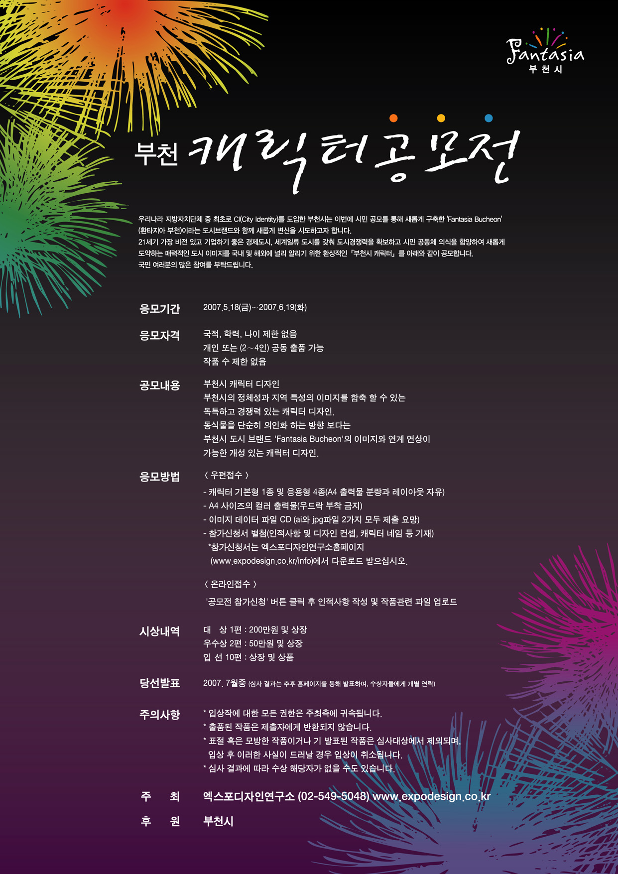 담당자 앞 ○ 심사기준 심사는 주최측이 위촉한 심사위원단에 의해 이루어지며 캐릭터로서의 친근함을 기본으로 독창성, 의미성, 조형성, 활용성 등이 심사기준이 됩니다. ○ 공모작 선정 및 시상 - 대 상 1편 : 200만원 및 상장 - 우수상 2편 : 50만원 및 상장 - 입 선 10편 : 상장 및 상품 ○ 당선발표 : 2007. 7월중 심사 결과는 엑스포디자인연구소 홈페이지를 통해 발표하며, 수상자들에게는 개별적으로 연락드립니다. ○ 출품작의 저작권 및 반출 가. 입상작에 대한 모든 권한은 주최측에 귀속됩니다. 나. 출품된 작품은 제출자에게 반환되지 않습니다. 다. 표절 혹은 모방한 작품이거나 기 발표된 작품은 심사대상에서 제외되며, 입상 후 이러한 사실이 드러날 경우 입상이 취소됩니다. 라. 심사 결과에 따라 수상 해당자가 없을 수도 있습니다. ○ 문의 공모전 관련 사항은 아래 연락처로 문의하시기 바랍니다. e-mail : naming@expodesign.co.kr (이메일 문의 권장) tel : 엑스포디자인연구소 02-549-5048 (담당자 : 김동환) 주 최: 엑스포디자인연구소 후 원: 부천시