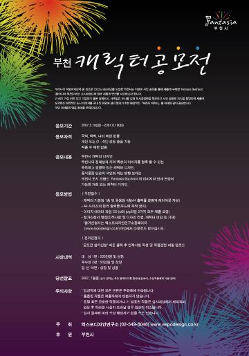 부천시 캐릭터 디자인 공모 우리나라 지방자치단체 중 최초로 ci(city identity)를 도입한 부천시는 이번에 시민 공모를 통해 새롭게 구축한 ''fantasia bucheon''(판타지아 부천)이라는 도시브랜드와 함께 새롭게 변신을 시도하고자 합니다. 21세기 가장 비전 있고 기업하기 좋은 경제도시, 세계일류 도시를 갖춰 도시경쟁력을 확보하고 시민 공동체 의식을 함양하여 새롭게 도약하는 매력적인 도시 이미지를 국내 및 해외에 널리 알리기 위한 환상적인『부천시 캐릭터』를 아래와 같이 공모합니다. 국민 여러분의 많은 참여를 부탁드립니다. □ 공모개요 ○ 공모기간 : 2007.5.18(금)~2007.6.19(화) ○ 응모자격 : 국적, 학력, 나이 제한 없음 개인 또는 (2~4인) 공동 출품 가능 작품 수 제한 없음 ○ 공모내용 : 부천시 캐릭터 디자인 ○ 디자인 주안점 : 부천시의 정체성과 지역특성의 이미지를 함축 할 수 있는 독특하고 경쟁력 있는 캐릭터 디자인. 동식물을 단순히 의인화 하는 방향 보다는 부천시 도시 브랜드 ''fantasia bucheon’의 이미지와 연계 연상이 가능한 개성 있는 캐릭터 디자인. 부천시의 이미지를 살리면서 국내 및 해외에 효과적으로 홍보할 수 있는 캐릭터 디자인 * 캐릭터 개발을 위한 자료수집은 부천시 홈페이지 (www.bucheon.go.kr)을 참고 ○ 공모방법 가. 우편접수시 - 캐릭터 기본형 1종 및 응용형 4종(a4 출력물 분량과 레이아웃 자유) - a4 사이즈의 컬러 출력물(우드락 부착 금지) - 이미지 데이터 파일 cd (ai와 jpg파일 2가지 모두 제출 요망) - 참가신청서 별첨(인적사항 및 디자인 컨셉, 캐릭터 네임 등 기재) *참가신청서는 엑스포디자인연구소홈페이지 (www.expodesign.co.kr/info)에서 다운로드 받으십시오. 나. 온라인 접수시 - ‘공모전 참가신청’ 버튼 클릭 후 인적사항 작성 및 작품관련 파일 업로드 ○ 접수기간 및 접수처 가. 접수기간 : 2007년 5월 18일 ~ 6월 18일까지(도착분까지 유효) 나. 접수방법 : 우편접수 (컬러출력물) 또는 온라인접수 (데이터파일) 가능 다. 접수처 주소 : 우) 135-090 서울특별시 강남구 삼성동60-3 엑스포디자인 b/d 엑스포디자인연구소