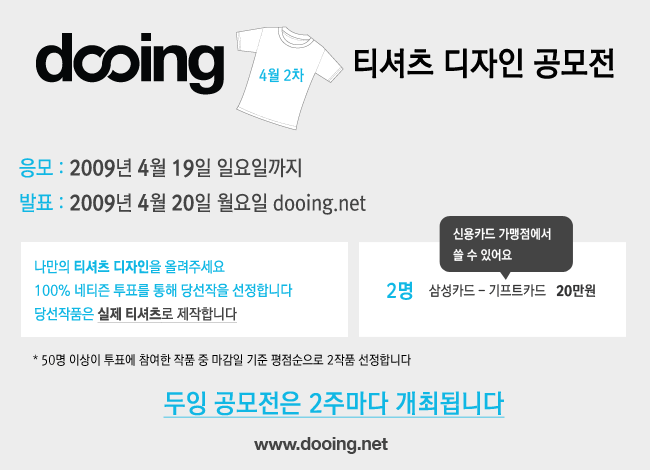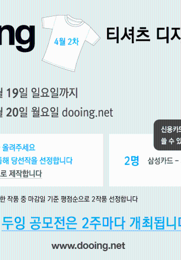 dooing.net 티셔츠 디자인 공모전 두잉 공모전은 2주마다 개최됩니다 2주에 2명에게 20만원씩의 상금을 지급합니다 티셔츠 디자인을 올려주시면 100% 네티즌 투표를 통해 우승작을 선정합니다 선정된 작품은 실제 티셔츠로 제작해 dooing.net에서 판매됩니다 기간: (4월 2차 공모) 2009년 4월 19일까지 대상: 제한없음 상금: 20만원(2명) 응모방법: http://www.dooing.net 에 가입 후 티셔츠 업로드 클릭 선정방법: 1. 50명 이상이 투표에 참여한 작품 중 2. 마감일(4월 19일) 기준으로 평점순으로 2작품 선정 문의: http://dooing.net/
