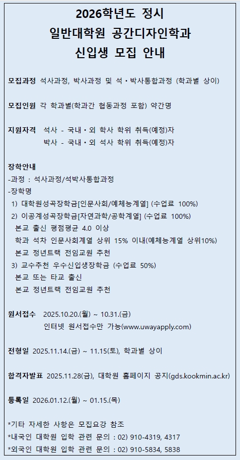 국민대학교 일반대학원 공간디자인학과가 2026학년도 정시 신입생을 모집한다.