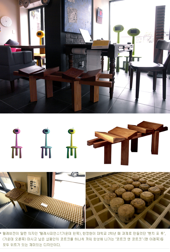 한정현은 소품을 비롯해 테이블, 시계 등을 디자인하고 있지만 유난히 편애를 하는 가구는 ‘의자’다. 대표작인 ‘텔레사피언스’, ‘벤치 포 투’는 물론이고 마시고 남은 샴페인의 코르크를 하나씩 끼워 완성해 나가는 ‘코르크 앤 코르크’ 등도 모두 의자다. “가구디자이너라면 모두 매력을 느끼는 오브제죠. 사람과 가장 오랜 시간 동안 몸에 가까이 닿는 가구야말로 의자인 것 같아요. 그래서 그만큼 다양한 이야기를 담을 수 있기도 하고요.” 가구디자이너로서 왕성히 활동하면서 상명대학교 공간디자인학과 출강과 각종 전시, 숍 운영까지 쉴 틈 없이 바쁜 요즘이지만 여전히 그녀는 살아서 이야기를 지닌 가구를 디자인한다. 그녀의 실험적인 가구 놀이터, 체어스 온 더 힐에서.