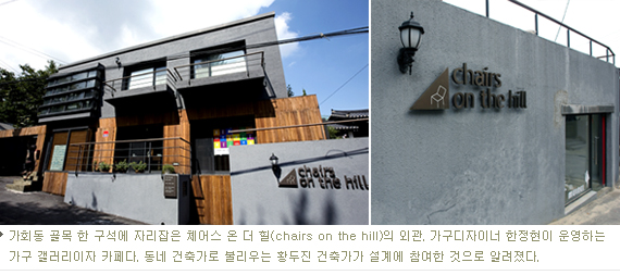얼핏 봐서는 이곳의 정체를 알 수 없다. 가회동사무소와 북촌미술관 사이 골목길 끝, 경사진 담벼락 밑에 자리 잡은 회색 건물. 정갈하고 수려한 외모의 건물 ‘체어스 온 더 힐’을 보자마자 ‘이런 동네에 이런 가게가 있네’하는 놀라움이 앞선다. 이곳의 정체는 숍 이름을 그대로 해석해도 무방한, 의자가 주가 되는 가구 갤러리 겸 카페다. 주인장은 미국에서 가구 디자인을 공부하고 귀국하여 우리나라 젊은 가구 디자이너의 대표주자가 된 한정현이다.