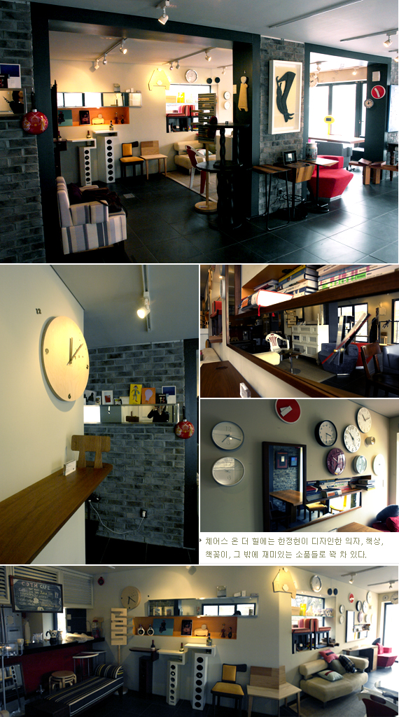 유리문을 열고 들어서면 그녀가 직접 디자인한 가구들과 수입한 인테리어 소품들의 향연이 펼쳐진다. 모던하고 군더더기 없는 디자인의 의자, 책상, 책꽂이, 그 밖에 흥미로운 아이템들도 꽉 차 있다. 다채로운 색상의 벽시계에 둘러싸여 있음에도 구경하는 재미에 시간가는 것도 잊게 만든다. 문득 지금이 몇 시인가 궁금해질 때 즈음, 한쪽 벽면을 차지하고 있는 ‘ㄴ’자 거울에 달린 시계가 눈에 들어온다. 초침 옆으로 거울 속에 비친, 파벽돌로 장식된 게이트로 아늑하게 구획된 공간이 일상에서 벗어난 해방감을 느끼게 한다. 그 가벼움과 편안함은 가구와 공간에 이야기를 담고자 하는 한정현의 노력과 가회동이라는 지역적 특성이 조화를 이루었기 때문이다. 해외에서 가구디자인을 전공하고 돌아온 한정현은 동네의 정취에 매료되어 이곳에 둥지를 틀기로 했다. “처음 문을 열 때만 해도 강남에 가구 가게가 많았죠. 전 복잡하고 어수선한 곳은 싫었고 한적하고 조용한 곳에서 작업하며 가게를 꾸리고 싶었어요. 가회동에 자리 잡아 문을 연 지 이제 2년 정도 되었는데, 아직까진 많이 알려지지는 않은 것 같아요. 조금 더 바쁘게 뛰어야죠. 저의 디자인 작업을 세상과 소통하고 싶으니까요.” 요란하지 않은 고즈넉한 동네를 배경 삼았지만, 그녀의 모습에는 ‘자기가 좋아하는 디자인’을 ‘좋아하는 공간’에서 하고 있다는 열정이 느껴졌다.
