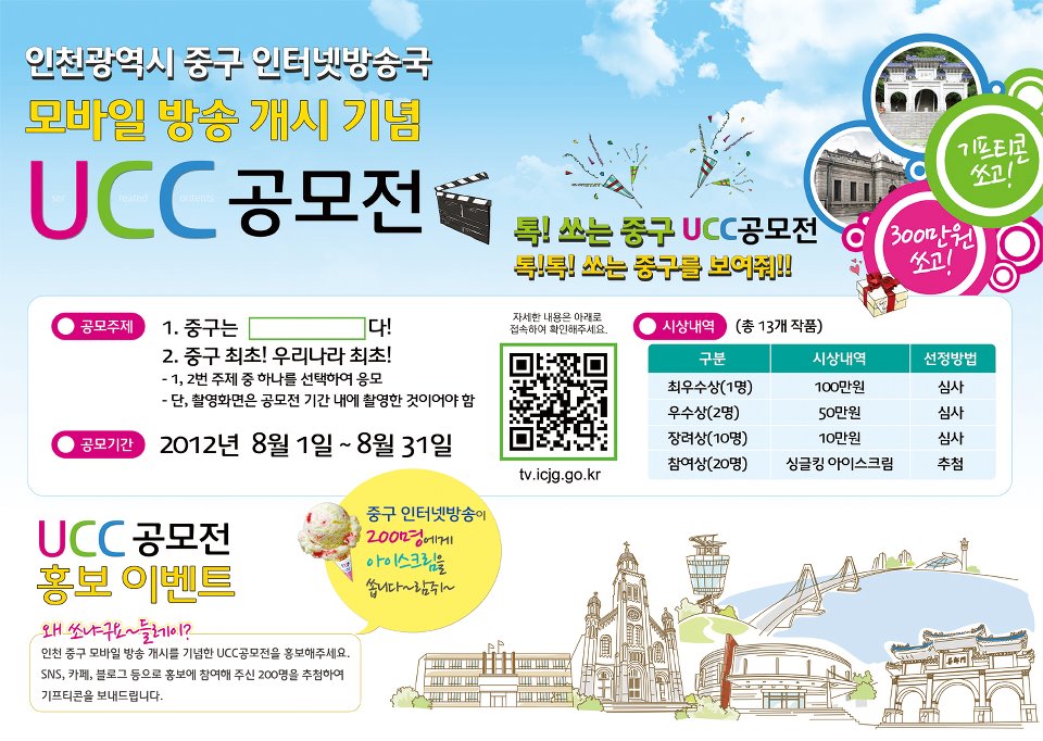 5. 응모방법 : 중구 인터넷방송국(http://tv.icjg.go.kr) youtube에 업로드 후 UCC 공모전 페이지를