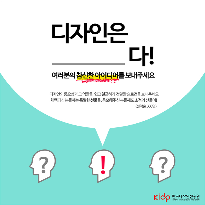 한국디자인진흥원은 디자인 산업과 문화의 발전을 위하여 전국의 모든 분들은 과연 디자인을 어떻게 생각하고 있으실지, 우리나라의 보편적 디자인 개념은 현재 어떠한지와 같은 다양한 궁금증을 품고있습니다. 이에 요번에 전국민을 대상으로 디자인 슬로건 공모전을 실시하게 되었습니다.
