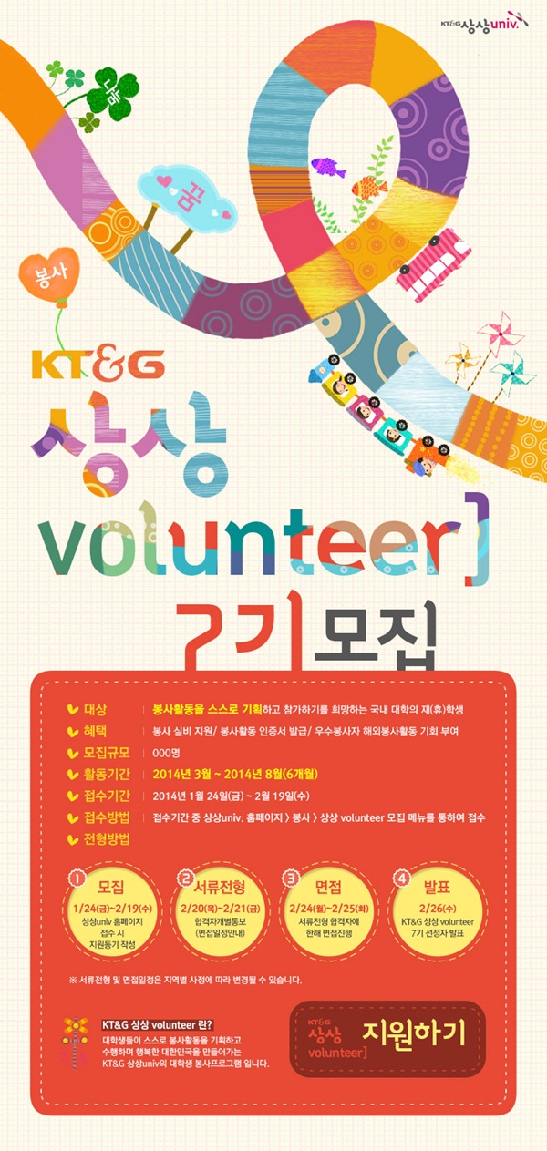 - 발표: 2014년 2월26(수) KT& G 상상 volunteer 7기 선정자 발표