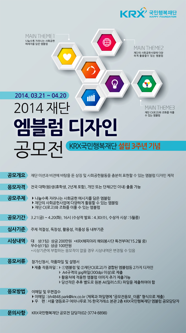 - 우편: 서울 영등포구 여의나루로 76 한국거래소 본관 2층 KRX 국민 행복재단 엠블럼 공모담당자