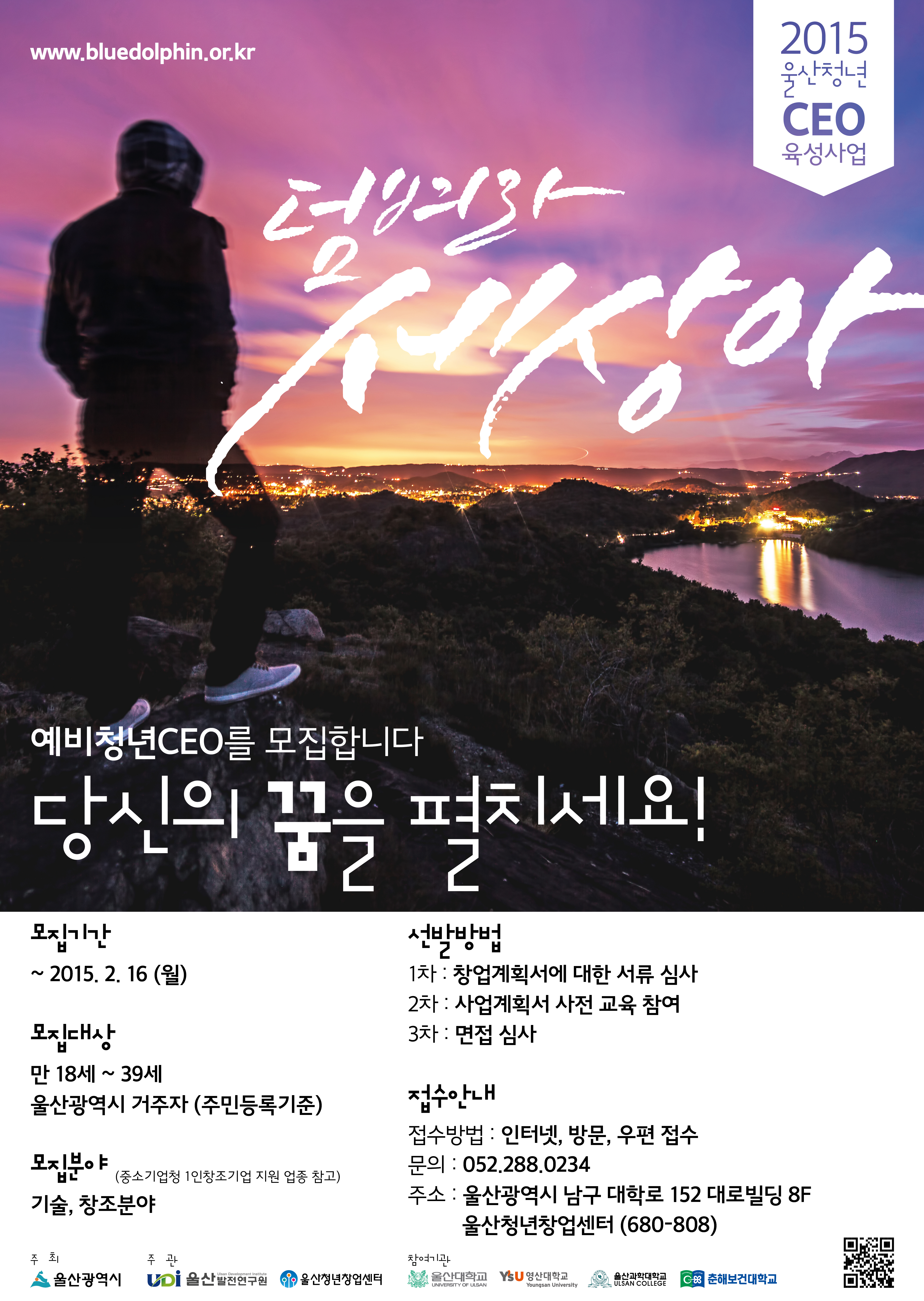 청년 창업 성공을 지원하는「2015년 울산청년CEO육성사업」을 시행하기 위하여 다음과 같이 예비청년CEO를 모집하고자 합니다. 2015. 1. 16. 울산광역시장