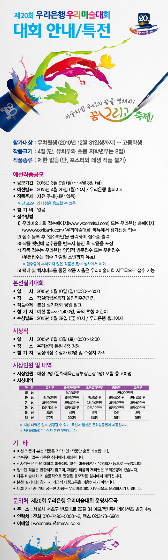 - 제20회 우리은행 우리미술대회 운영사무국 서울시 서초구 반포대로22길 34 에프엠커뮤니케이션즈빌딩 070-7490-5000~2, woorimisul@fmmail.co.kr