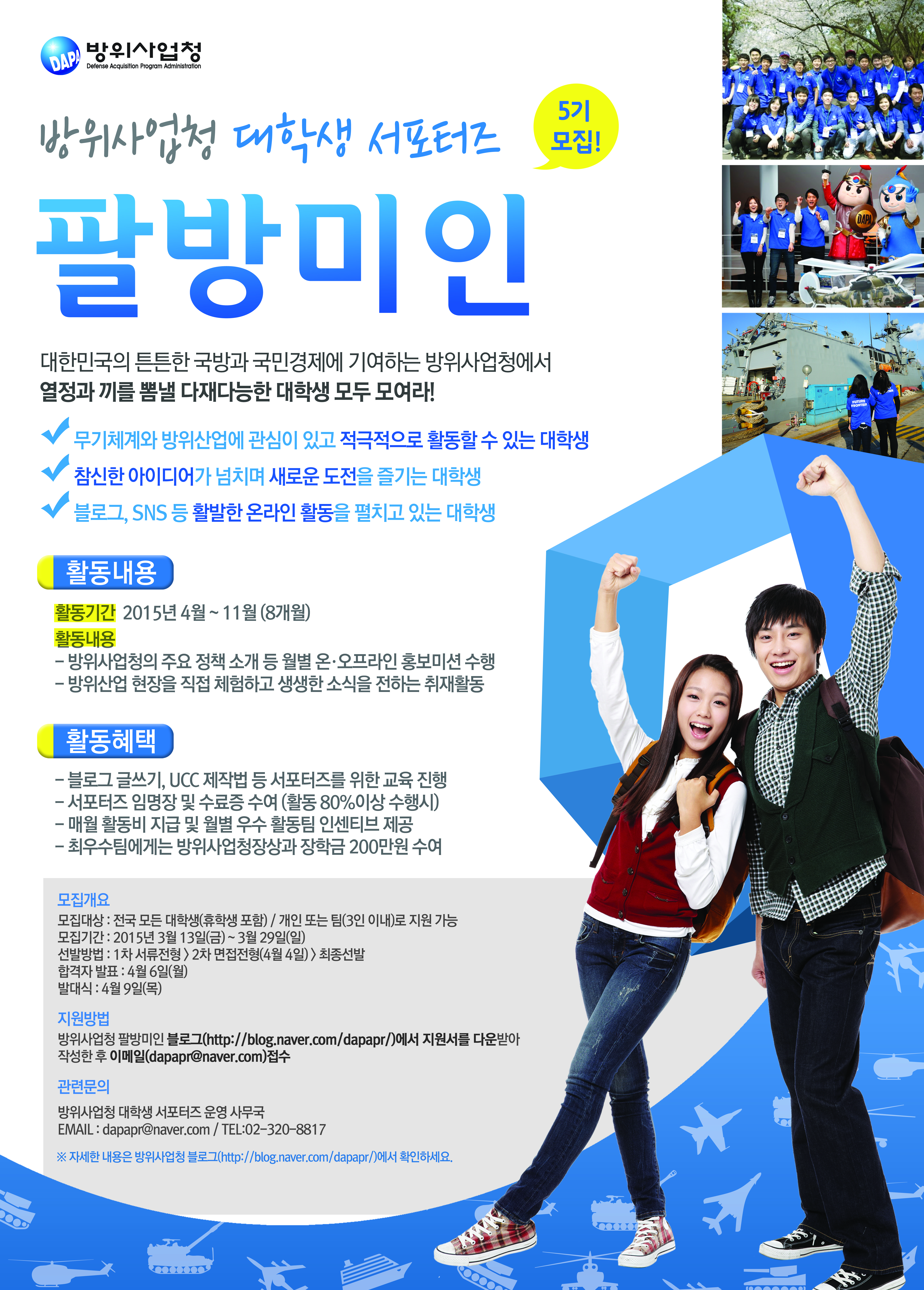 - 방위사업청 팔방미인 블로그(http://blog.naver.com/dapapr/)에서 참가신청서를 다운받아 작성한 후 이메일(dapapr@naver.com)접수
