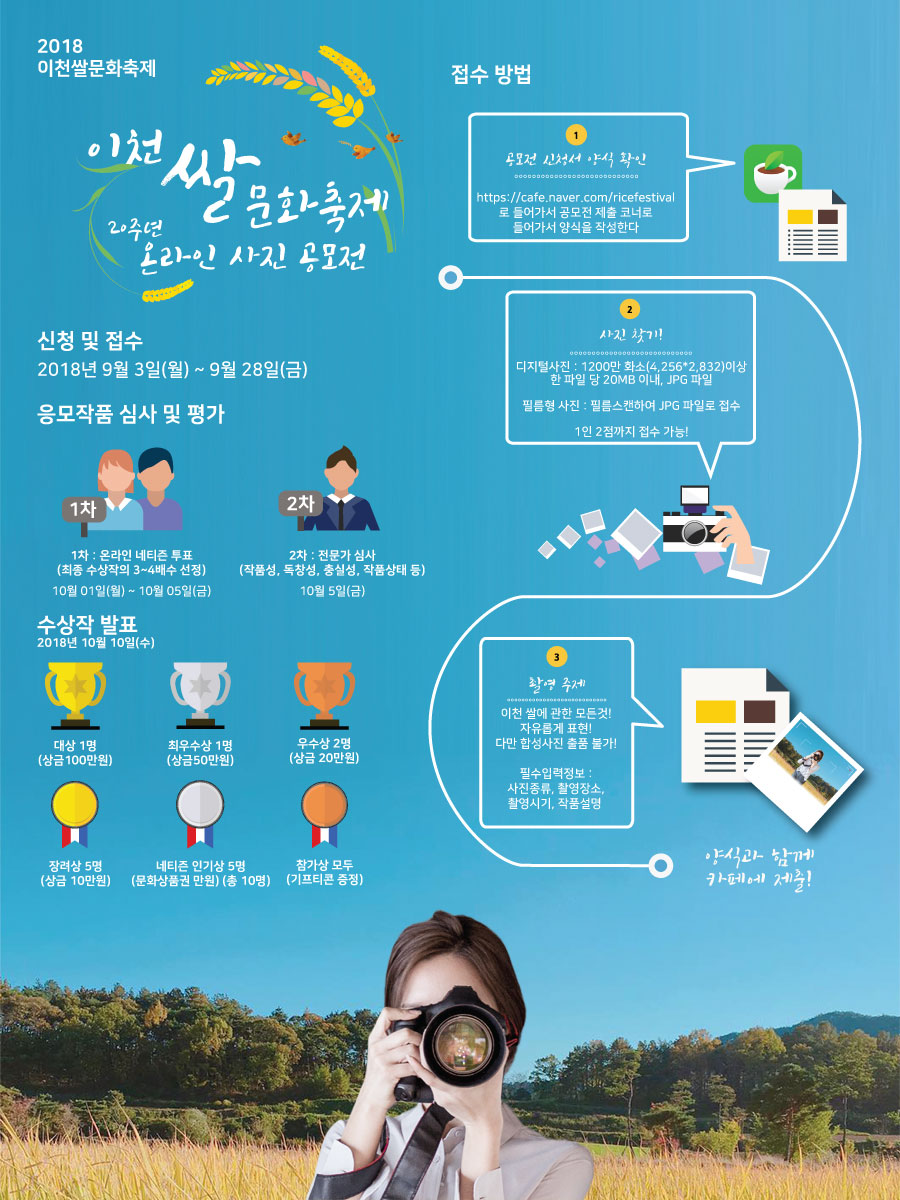 - 네이버 카페 "이천 쌀문화축제 온라인 사진 공모전"에서 공모전 신청 양식을 확인 후 양식 작성 및 사진 게재