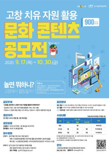 ※ 고창문화관광재단 홈페이지(http://gctf.or.kr) → 열린광장 → 공지사항 → '고창 치유자원 활용 문화콘텐츠 공모전'