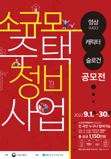 국민에게 친근하게 다가가고, 타 정비사업과 차별화를 줄 수 있는 소규모주택정비사업(개별사업 포함) 영상, 캐릭터, 슬로건을 공모합니다.