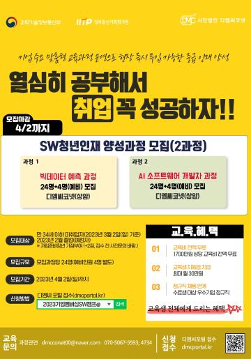 ○ 사업명: 4차 산업 지역거점 클러스터 SW청년인재 양성○ 사업목적: 기업 수요 맞춤형 교육과정 운영으로 현장 즉시 투입 가능한 중·고급 인재 양성 및 채용연계 지원○ 교육 기간: 23년 03월 27일~23년 11월 01일(150일, 총 1200시간)○ 교육 시간: 월~금 09:00~18:00(1일 8시간)2023 기업멤버십 SW캠프 청년인재 양성과정 모집(빅데이터/AI)기업 수요 맞춤형 교육과정 운영으로 현장 즉시 투입 가능한 중·고급 인재 양성 및 채용연계 지원○ 교육 장소: 서울(상암)