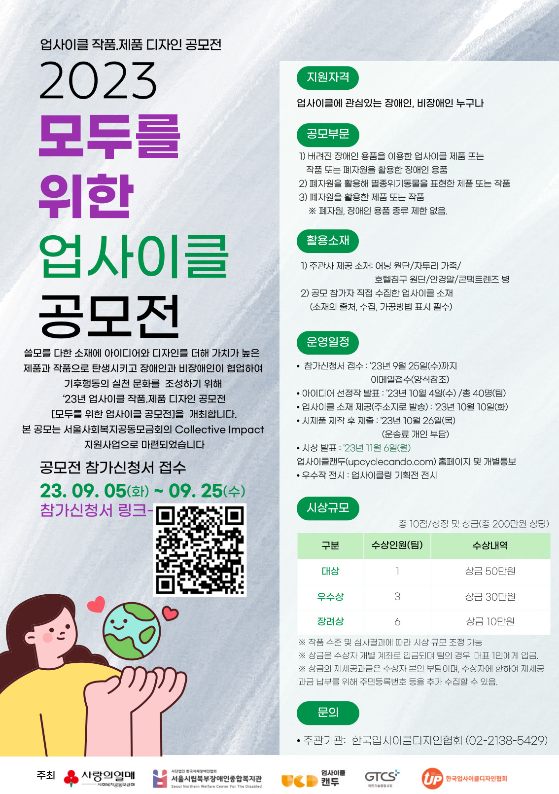 1) 버려진 장애인 용품을 이용한 업사이클 제품 또는 작품 또는 폐자원을 활용한 장애인 용품2) 폐자원을 활용해 멸종위기동물을 표현한 한 제품 또는 작품3) 폐자원을 활용한 제품 또는 작품※ 폐자원, 장애인 용품 종류 제한 없음.