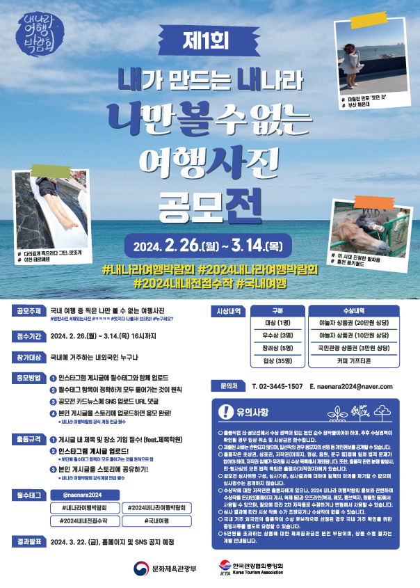 - 수상작에 대한 저작권은 출품자에게 있으나, 2024 내나라 여행박람회 홍보와 관련하여 수상작을 온라인