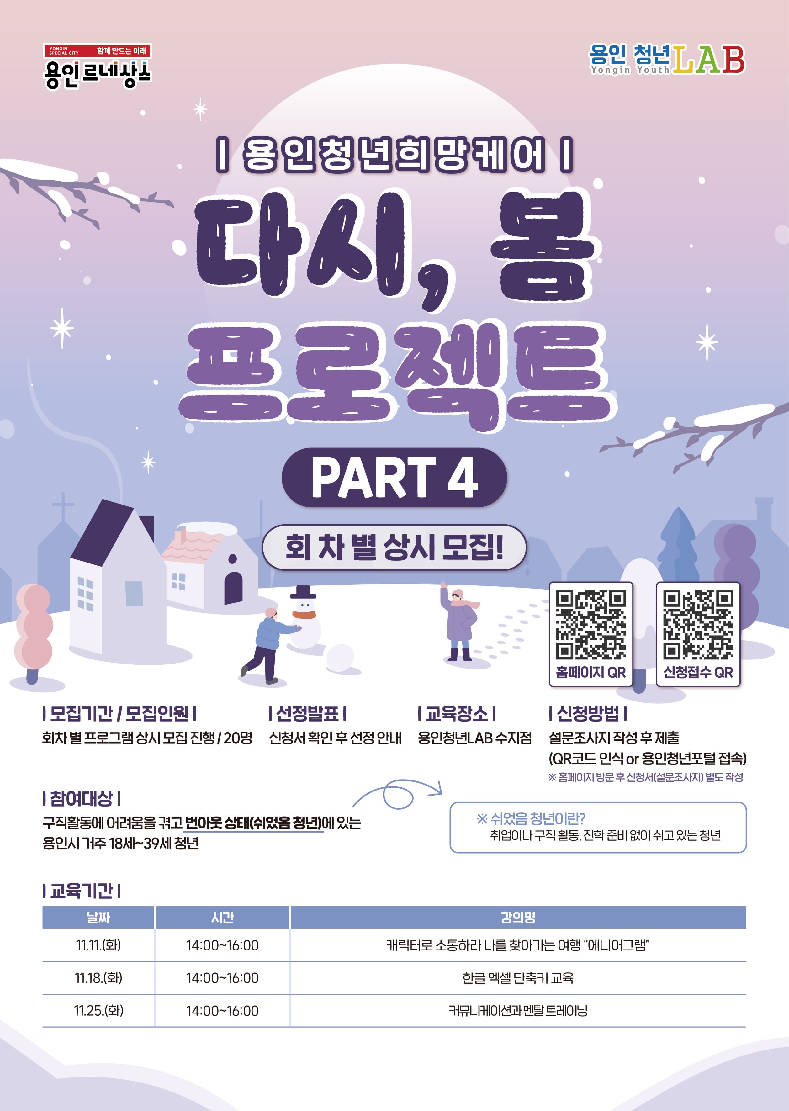 ■ 신청 방법 : "용인청년포털 청년e랑 접속 후 메인 배너 클릭(다시, 봄 프로젝트) 후 신청서 작성" 혹은 "현재 게시글 신청 접수 QR코드 인식 후 신청서 작성"