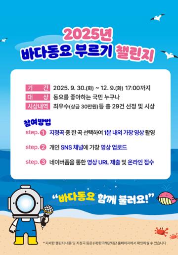 - 자세한 챌린지 내용 및 지정곡 등은 (재)한국해양재단 홈페이지에서 확인하실 수 있습니다.