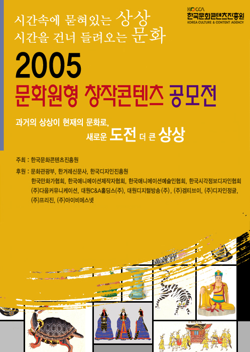 문화관광부와 한국문화콘텐츠진흥원에서는 우리 역사 안에서 숨쉬고 있는 문화원형을 창의적으로 발전시켜 문화콘텐츠산업에 활용하기 위한 공모전을 마련합니다. 참신하고 역량있는 창작자 여러분의 많은 참여와 아낌없는 성원을 기대합니다. □ 추진목적 ㅇ 고유의 문화정체성과 창의력을 확보하는 문화원형 창작소재의 활용을 촉진하고 문화원형에 대한 국민적 이해와 관심을 증진 ㅇ 참신한 아이디어를 지닌 역량있는 창작자 발굴 및 창작의욕 고취 ㅇ 우수 문화원형 창작콘텐츠의 개발 및 산업계 연계진행을 통한 작품의 상품화 유도 □ 주 최 : 한국문화콘텐츠진흥원 □ 후 원 : 문화관광부, 한겨레 신문, 한국디자인진흥원, (사)한국만화가협회, (사)한국애니메이션제작자협회, (사)한국애니메이션예술인협회, (사)한국시각정보디자인협회, SK텔레콤(주), (주)다음커뮤니케이션, 대원C&A홀딩스(주), (주)대원디지털방송, (주)겜티브이, (주)디자인정글, (주)프리진, (주)아이비에스넷 □ 공모분야 ㅇ 만화 분야 : 극화, 웹툰, 모바일만화 등 온라인 또는 모바일에서 활용 가능한 콘텐츠의 창작 ㅇ 영상 분야 : Flash, 2D, 3D, 모션그래픽, 폰배경 애니메이션 등 온라인 또는 모바일 동영상의 창작 ㅇ 디자인분야 : 웹페이지 디자인(웹디자인 탬플릿 포함)의 창작 □ 응모자격 : 일반/학생 구분 ㅇ 학생 : 2년제 대학 이상 대학(원)생 (2006년 2월 졸업 예정자 포함) ㅇ 일반 : 만 20세 이상 성인 □ 응모조건 ㅇ 문화원형 창작소재를 직,간접적으로 활용한 작품 대상 - 현재 문화콘텐츠닷컴(www.culturecontent.com)을 통해 제공되는 문화원형 콘텐츠로 제한 - 문화원형 창작소재의 다양한 시나리오, 이미지, 캐릭터 등을 활용하여 창작자의 창의성과 독창성이 부여된 창작콘텐츠 개발 ※타 공모전에 입상한 작품 혹은 모방작품은 심사대상에서 제외 □ 문화원형 콘텐츠 활용방법 ㅇ 문화콘텐츠닷컴(www.culturecontent.com) 활용 - 공모전 이벤트 페이지 → 문화콘텐츠닷컴 회원가입 또는 공모전회원가입 → 문화원형 리소스자료 및 총람 다운로드 → 종료 ※기타 문화원형 소재는 문화콘텐츠닷컴 콘텐츠 검색 및 구매 활용 □ 심사 및 결과발표 ㅇ 심사기준 - 문화원형 창작소재의 특성을 고려한 활용의 적합성 - 실용성을 바탕으로 상품제작에 손색이 없는 작품 - 제작컨셉의 일관성 및 완성도 - 아이디어의 독창성 등 - 타공모전 출품작 배제 ㅇ 심 사 : 2006. 2. 1(수) ~ 2006. 2. 15(수) (예정) ㅇ 결과발표 : 2006. 2월 중순 ※입상자 개별통지, 관련기관 홈페이지 공고 □ 시상 및 시상내역 ㅇ 일시/장소 : 2006. 2. 21(화) 예정 ㅇ 시상내용 : 대상, 우수상, 장려상 상금 및 상패 수여 ㅇ 시 상 자 - 대 상 : 총 1명(통합), 상금 5백만원 및 상패 - 우수상 : 총 6명(일반 3명, 학생 3명) 각 2백만원 및 상패 - 장려상 : 총 12명(일반 6명, 학생 6명), 각 50만원 및 상패 - 입 선 : 총 30명(일반 15명, 학생 15명), 각 5만원 문화상품권 및 상장 □ 접수 및 문의 ㅇ 신청서 교부 : 2005 문화원형 창작콘텐츠 공모전 홈페이지 (http://gongmo.culturecontent.com) ㅇ 접수기간 : 2006. 1. 9(월) ~ 2006. 1. 27(금) 18:00 마감 ㅇ 접수방법 : 온라인 접수 원칙 (http://gongmo.culturecontent.com) - 공동참가 시 3명 이내에서 팀 구성이 가능하며, 대표자를 지정하여 응모 - 1인(팀)당 작품 응모 수는 제한 없으며, 복수의 작품 출품 시에는 1개 작품 당 1개 접수번호를 부여 받아야 함 ㅇ 접수 및 문의 - 접 수 처 : 한국문화콘텐츠진흥원 "2005 문화원형 창작콘텐츠 공모전" 사무국 - 주 소 : 서울시 강남구 역삼동 641-2 한국문화콘텐츠진흥원 2005 문화원형 창작콘텐츠 공모전 사무국 - 연락처 : 02)2166-2035 / gongmo@kocca.or.kr □ 작품 규격 및 제출물 ㅇ 참가자 공통 - 출품신청서 1부(소정양식 다운로드) - 작품소개서 1부(소정양식 다운로드) : 응모작 소개, 제작의도 - 작품설명서 1부(소정양식 다운로드) : 작품 특성 및 내용 설명 ※타인명의 응모, 사전 공개 작품은 접수가 불가하며, 발견 시 선정 후라도 입상 취소 ㅇ 응모부문별 규격 및 제출물 - 만화분야 ◎ 극화의 경우 원고 사이즈(900*1300 픽셀 해상도300dpi의 jpg 파일), 원고 페이지명은 ‘001.jpg 부터 시작, 12페이지 이상의 원고 ◎ 웹툰의 경우 인터넷 등록 가능한 작품별 1페이지 분량의 원고 (컷수 제한 없음) ◎ 모바일만화의 경우 사이즈(1컷 : 가로 240 Pixel × 세로 192 Pixel), 길이 50컷 이상, 파일포맷 BMP, PSD, 파일명 001.BMP, 001.PSD로 시작 - 영상분야 ◎ Flash, 2D, 3D, 모션그래픽 등의 경우 장르제한 없으며, 규격 및 분량(640× 480 pixel/30초이상 3분이내), 파일종류 플래쉬(*.swf), 애니메이션(*.gif), 동영상(*.mpg,*.avi) ◎ 폰배경 애니메이션(모션이 포함된 캐릭터다운로드, 폰스크린세이버, 배경화면 등의 Skin Design)의 경우 120*144 픽셀 3초이내, (1초당 3~5 Frame) (gif 애니매이션) - 디자인분야 ◎ 웹페이지 디자인 1종(메인과 서브페이지 각 1페이지씩 총 2페이지), 사이즈 가로(1024 pixel 이하)/세로(제한 없음), 해상도 72dpi 이상, 용량/파일 제한없음 ※자세한 내용은 http://gongmo.culturecontent.com 참조 □ 응모 기타사항 ㅇ 접수 마감시간 엄수 및 온라인 접수만 가능 ㅇ 수상작 결정은 신청인 명의로 하며, 공동제작