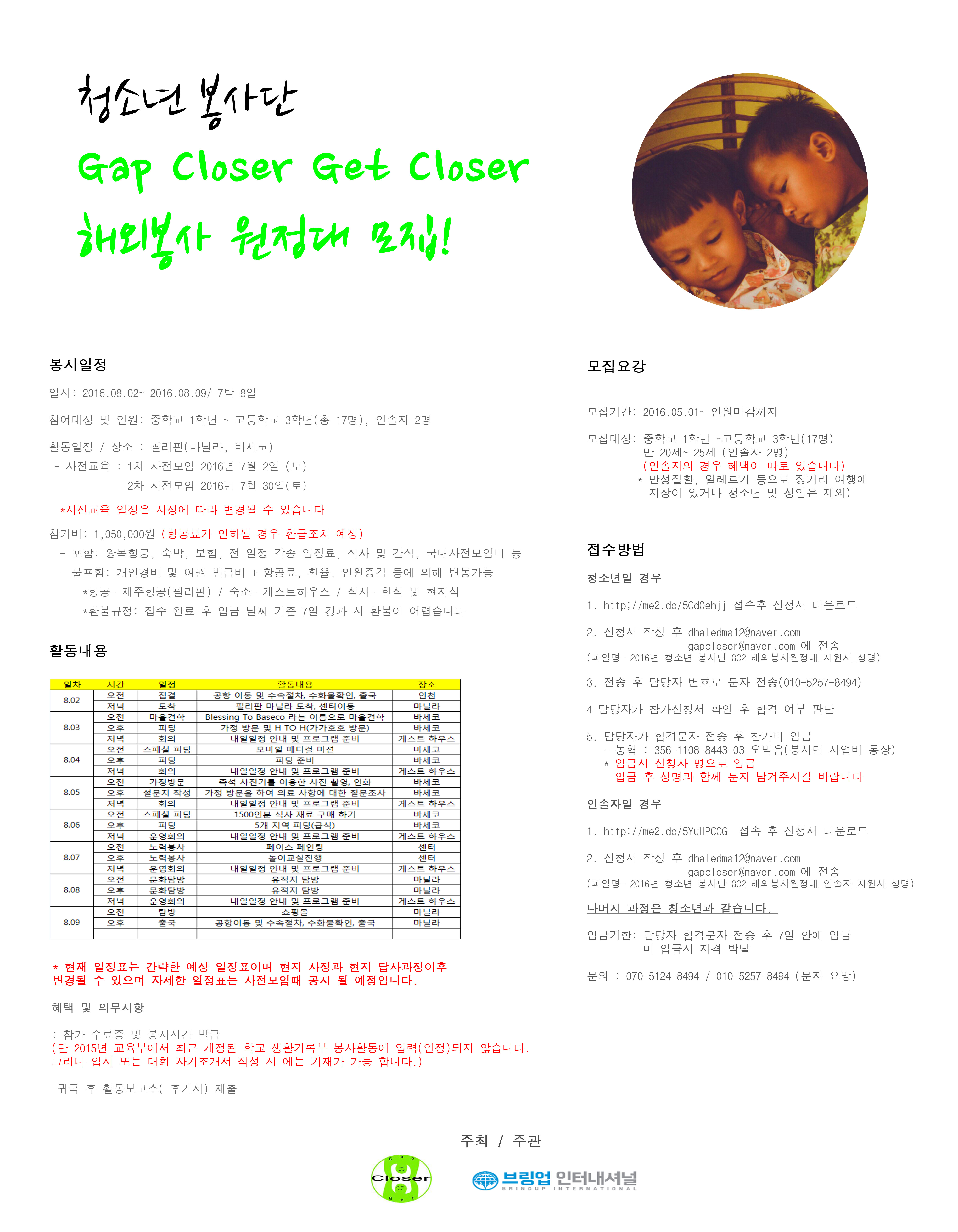 ② 신청서 작성 후 dhaledma12@naver.com/ gapcloser@naver.com 전송 (파일명_2016년 청소년봉사단 GC2 해외봉사원정대_인솔자_지원서_성명) 나머지 과정은 청소년과 동일 합니다.