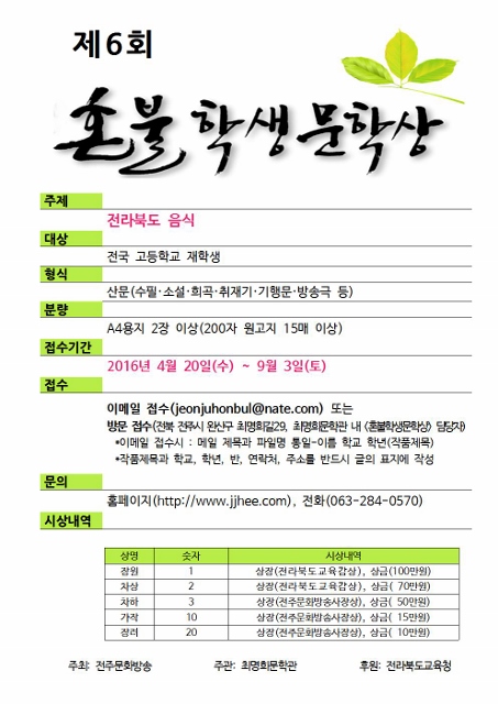 (전북 전주시 완산구 최명희길29 최명희문학관 내 <혼불학생문학상> 담당)