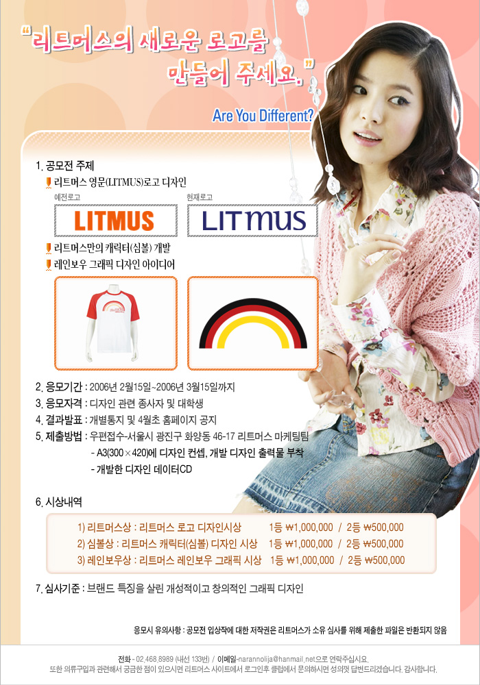 < 내 용> ㄱ. 공모전 주제 - ①리트머스 영문(LITMUS) 로고 디자인 - ②리트머스만의 캐릭터(심볼)개발 - ③레인보우 그래픽 아이디어 ㄴ. 응모기간 : 2006년 2월 15일부터 3월 15일까지 ㄷ. 결과발표 : 개별통지 및 4월초 홈페이지 공지 ㄹ. 제출방법 : 우편접수 - 서울시 광진구 화양동 46-17 리트머스 마케팅팀 - A3(300*420)에 디자인컨셉, 개발 디자인 출력물 부착 개발한 디자인 데이터 CD ㅁ. 시상내역 ①리트머스상 : 리트머스 로고 디자인 시상 1등 - \ 1,000,000 / 2등 - \ 500,000 ②심 볼 상 : 리트머스 캐릭터(심볼) 디자인 시상 1등 - \ 1,000,000 / 2등 - \ 500,000 ③레인보우상 : 리트머스 레인보우 그래픽 시상 1등 - \ 1,000,000 / 2등 - \ 500,000 ㅂ. 문의 - 리트머스 홍보팀 468-8989, www.fashionlitmus.co.kr ㅅ. 주의사항 - 출품작은 국내외 미 발표작에 한합니다. - 타 공모전 입상작, 표절작은 입상을 취소합니다. - 출품작의 저작권은 리트머스로 귀속됩니다.