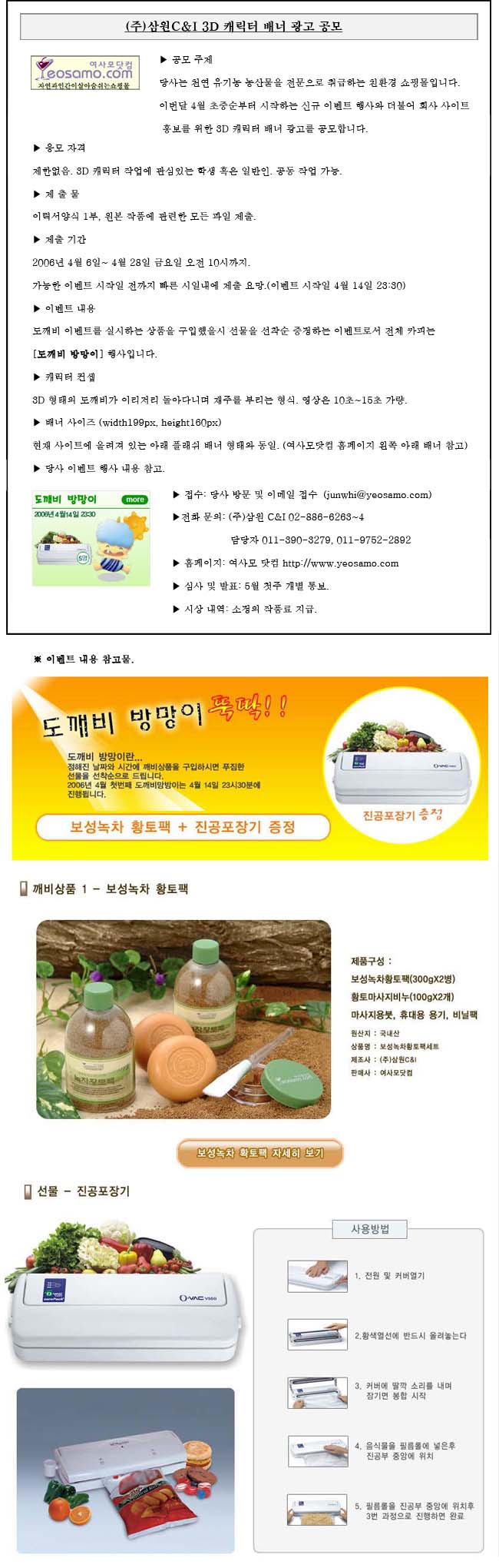 (주)삼원C&I 3D 캐릭터 배너 광고 공모 ▶ 공모 주제 당사는 천연 유기농 농산물을 전문으로 취급하는 친환경 쇼핑몰입니다. 이번달 4월 초중순부터 시작하는 신규 이벤트 행사와 더불어 회사 사이트 홍보를 위한 3D 캐릭터 배너 광고를 공모합니다. ▶ 응모 자격 제한없음. 3D 캐릭터 작업에 관심있는 학생 혹은 일반인. 공동 작업 가능. ▶ 제 출 물 이력서양식 1부, 원본 작품에 관련한 모든 파일 제출. ▶ 제출 기간 2006년 4월 6일~ 4월 28일 금요일 오전 10시까지. 가능한 이벤트 시작일 전까지 빠른 시일내에 제출 요망.(이벤트 시작일 4월 14일 23:30) ▶ 이벤트 내용 도깨비 이벤트를 실시하는 상품을 구입했을시 선물을 선착순 증정하는 이벤트로서 전체 카피는 [도깨비 방망이] 행사입니다. ▶ 캐릭터 컨셉 3D 형태의 도깨비가 이리저리 돌아다니며 재주를 부리는 형식. 영상은 10초~15초 가량. ▶ 배너 사이즈 (width199px, height160px) 현재 사이트에 올려져 있는 아래 플래쉬 배너 형태와 동일. (여사모닷컴 홈페이지 왼쪽 아래 배너 참고) ▶ 당사 이벤트 행사 내용 참고. ▶ 접수: 당사 방문 및 이메일 접수(junwhi@yeosamo.com) ▶전화 문의: (주)삼원 C&I 02-886-6263~4 담당자 011-390-3279, 011-9752-2892 ▶ 홈페이지: 여사모 닷컴 http://www.yeosamo.com ▶ 심사 및 발표: 5월 첫주 개별 통보. ▶ 시상 내역: 소정의 작품료 지급. 꼭 연락처와 자기 소개 양식을 메일로 보내 주시기 바랍니다.