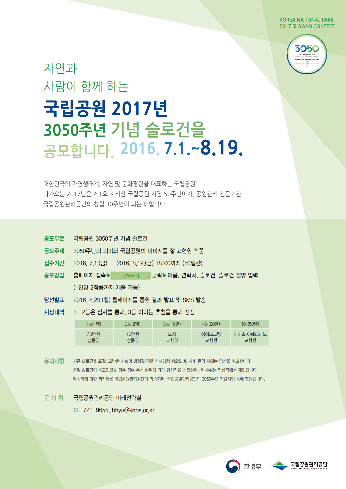 - 당선작에 대한 저작권은 국립공원관리공단에 귀속되며, 국립공원관리공단의 3050주년 기념사업 등에 활용됩니다.