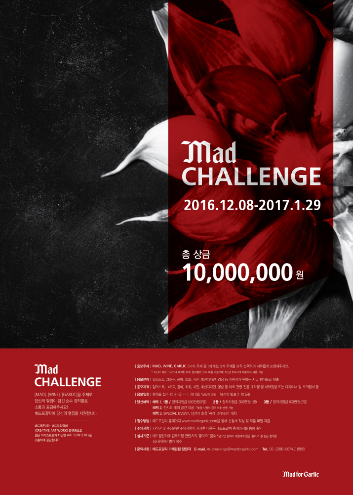 안녕하세요 여러분 마늘과 와인으로 콘셉트를 특화한 이탈리안 레스토랑 매드포갈릭에서 총 상금 10,000,000원 및 각종 혜택이 주어지는 MAD CHALLENGE 공모전을 실시합니다 MAD , GARLIC , WINE 3가지주제로 자유롭게 표현해주세요. 많은 참여와 관심 부탁드립니다.
